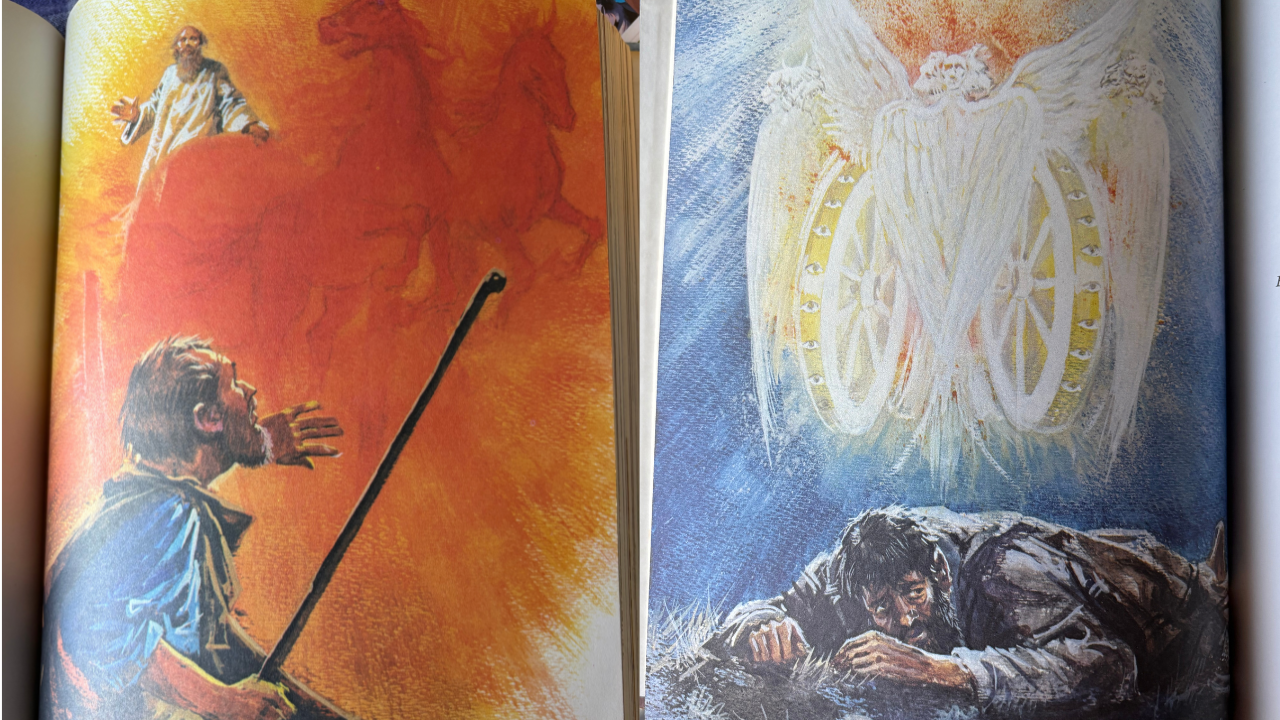 When I was young, maybe eight or ten, I remember sitting on the cold concrete floor of our basement, and leafing through the illustrated children's Bible my aunt and uncle--my godparents--had given me for my baptism when I was an infant. I remember pondering two illustrated scenes (they've melded in my memory into one, but they're two images). The two images are evocative, depictions of glory from the Elder Testament.